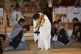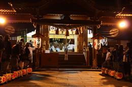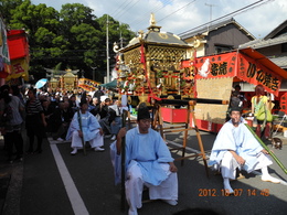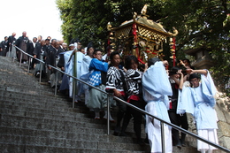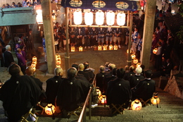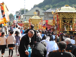 香西宇佐八幡宮は、10月第1土・日曜日の秋祭りが例大祭にあたる。 香西・鬼無・下笠居の頭屋から(香西2人、鬼無1人、下笠居1人)選ばれたその年のトウニン(頭人)4名がヨイノボシ(前夜からの神事)を行ったあと、神主によって3基の神輿(みこし)に祭神(八幡三神)のミタマウツシを行い、御旅所(おたびしょ)まで(お下がり)する。 (お下がりの練り物の順番) 獅子(佐藤・藤井・是竹・本津・中塚・平賀・生島・植松・川窪・中山・作山・港町・明神・会下・釣西)15頭 太鼓台1台 小奴2 飾り船(元船・小船)2 御輿 3 頭人・お供・宮司・氏子 宇佐八幡の例大祭 御旅所での奉納や神事が終わると還幸(お帰り)にはいるが、還幸行列での練り物の順番は「お下がり」の時と逆順になり、元船が先頭で最後獅子で、それぞれが時間をかけて、頭人・お供・宮司・氏子の行列で神社へ帰り、御神霊を拝殿に納めると頭人は「別れの盃」を交わして、お開きになる。練り物はお船の止め唄(奉納の最後にのみ歌う唄)が出ると、後は頭屋の地区の獅子が遣うだけ遣ってから引き揚げる。 令和5年5月 山田様に提供して頂いた 2015年宇佐八幡秋祭りの出し物を追加しました |